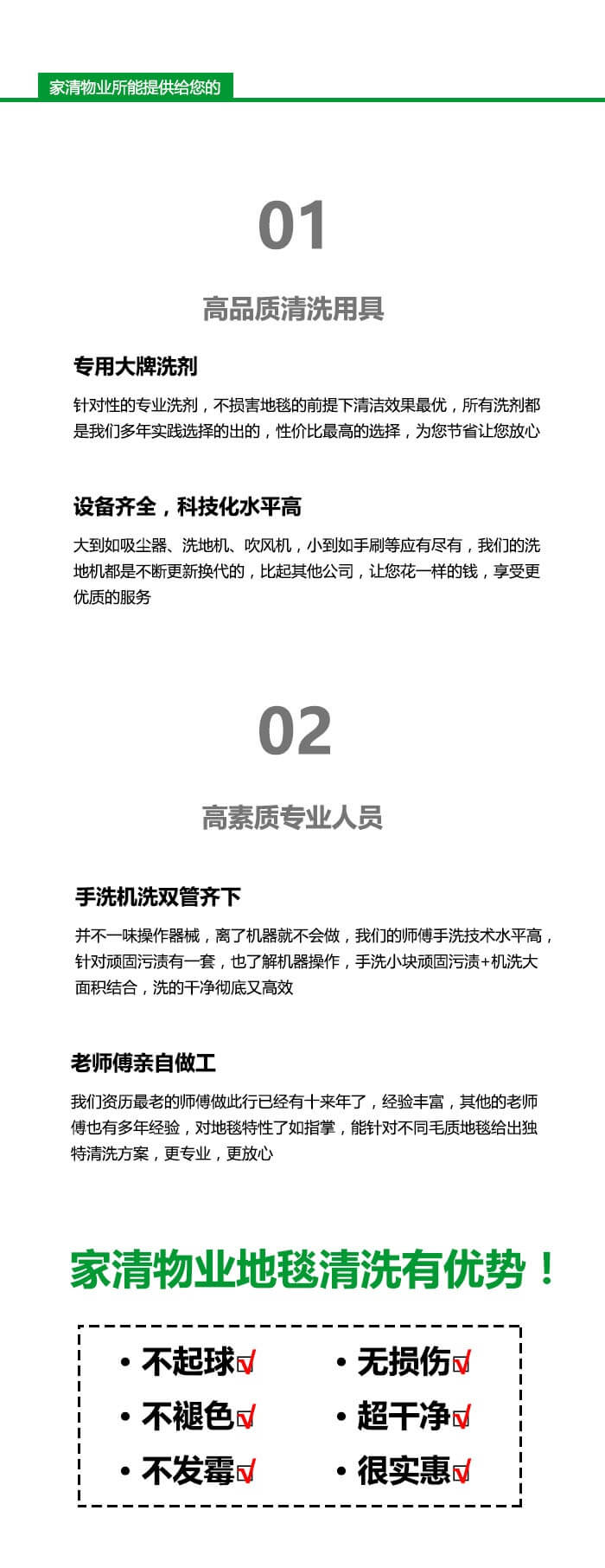 1、家清物業(yè)有專業(yè)地毯清洗團(tuán)隊(duì),地毯清洗技工具有十二年的地毯清洗經(jīng)驗(yàn);