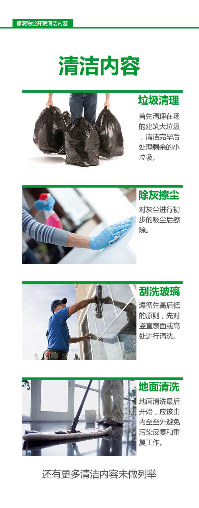 服務(wù)內(nèi)容:擦拭玻璃,牽塵,表面養(yǎng)護(hù),清洗地面,廚廁除污消毒,裝修痕跡清理,打蠟等。
