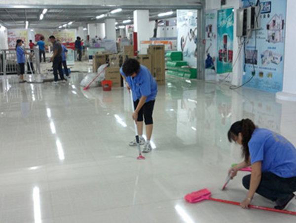 3、洗地面:地磚表面使用洗地機(jī)配合硬質(zhì)地坪清洗劑處理,真空吸水機(jī)清理,使地面清潔更顯光澤。